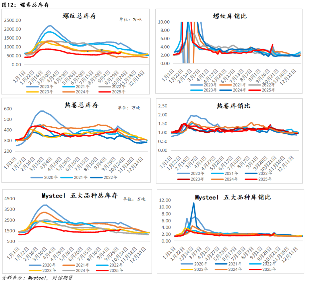 从库存角度来看(以Mysteel五大品种为对象),假期间钢厂产量维持高位,库存压力进一步加大,关注节后需求恢复速度及库存下降速度。分品种来看,以螺纹钢为代表的建材库存绝对值处于近6年中性水平,但受弱需求影响,库销比整体处于近6年同期偏高水平;热卷总库存绝对值偏高,库销比亦处高位。整体来看,铁水产量维持高位背景下,对钢材需求提出了更高要求,钢材库存压力仍待缓解。