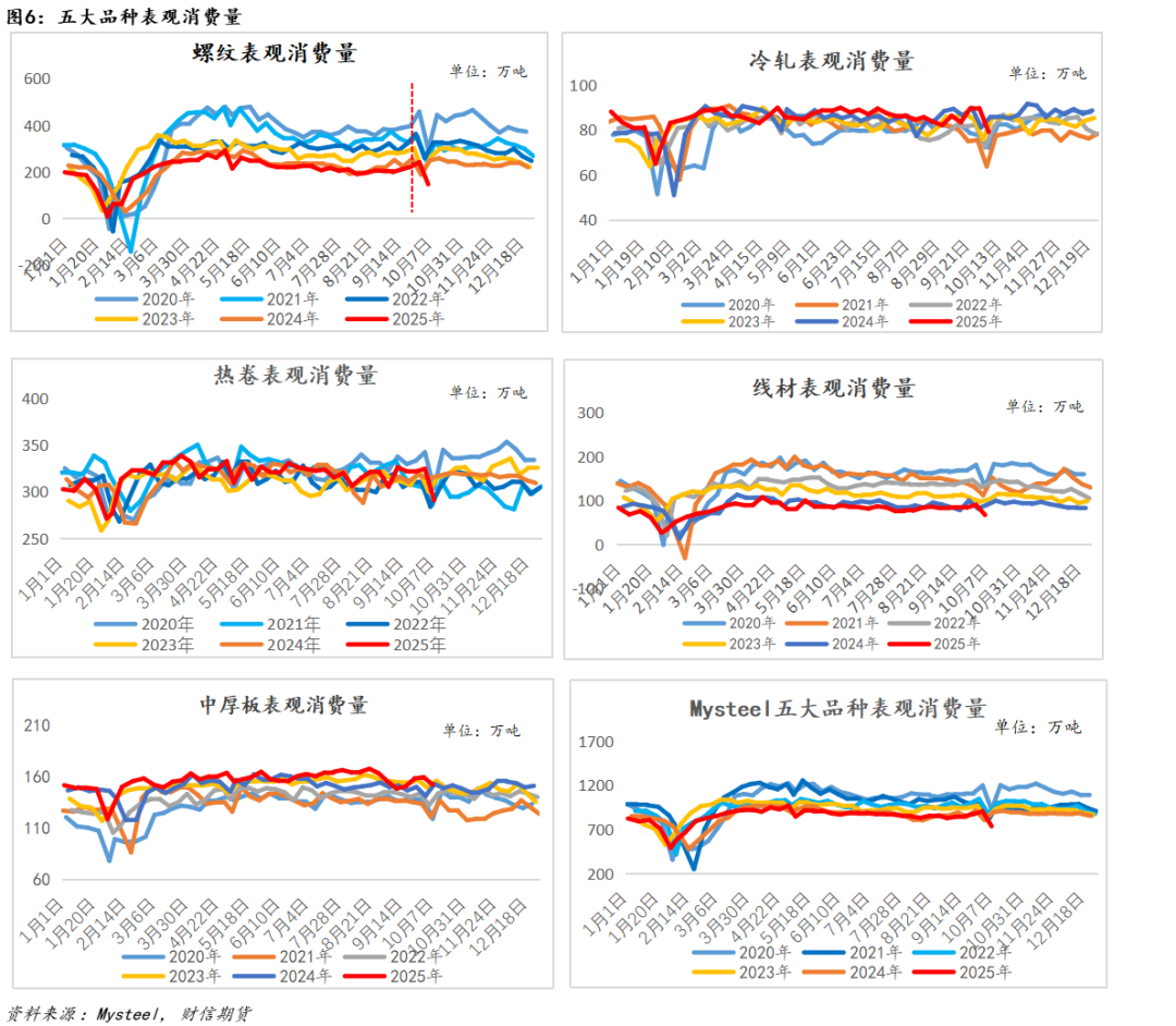 从需求表现来看(以Mysteel五大品种为例),需求整体表现不及预期。据Mysteel,节假期间各品种需求都有所回落,且五大品种需求表现创近6年同期最低水平。考虑到数据受假期有一定的扰动,后期重点关注建材需求回升速度。