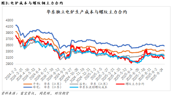从静态估值来看,螺纹钢主力01合约全面跌破钢厂螺纹生产成本,静态估值中性略低。据富宝资讯,截止10月10日,华东独立电炉平电生产成本在3321元/吨,华东独立电炉谷电生产成本在3191元/吨(各地区谷电平均平均成本在3190元/吨),华东长流程螺纹钢生产成本在3159元/吨。钢材需求驱动整体不足(建材旺季需求高度或有限),市场对螺纹盘面定价不高于华东独立电炉谷电生产成本,悲观预期下,短期华东长流程螺纹成本或是螺纹钢01合约压力位所在。