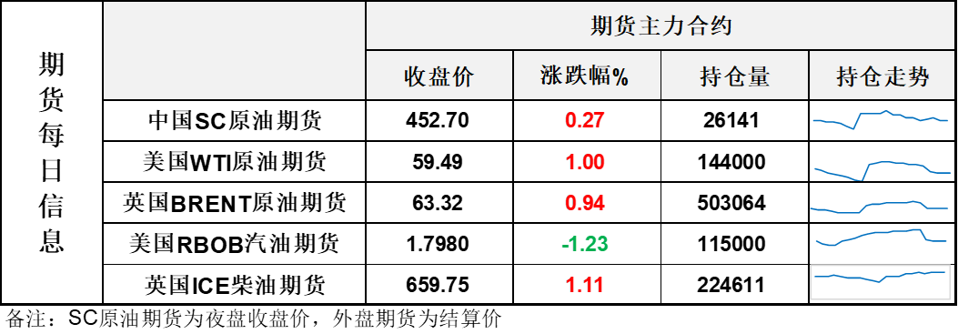 【1】WTI主力原油期货收涨0.59美元,涨幅1%,报59.49美元/桶;布伦特主力原油期货收涨0.59美元,涨幅0.94%,报63.32美元/桶;INE原油期货收涨0.27%,报452.7元。