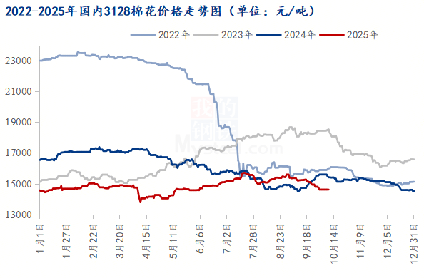 10月13日,国内新疆棉3128B现货价格为14631元/吨,较昨日跌37.00元/吨;郑棉主连收于13300元/吨,跌25 ,跌幅0.19 ;期现基差(现货价格-郑棉主连收盘价)为1331元/吨。当前新疆棉花正有序推进采收与交售工作,加工环节进度明显加快。下游市场需求端表现平淡,纺织企业开机率虽保持稳定,但较去年同期仍有差距。综合来看,受宏观市场情绪趋弱、新棉陆续上市等因素叠加影响,预计棉花价格维持震荡运行。