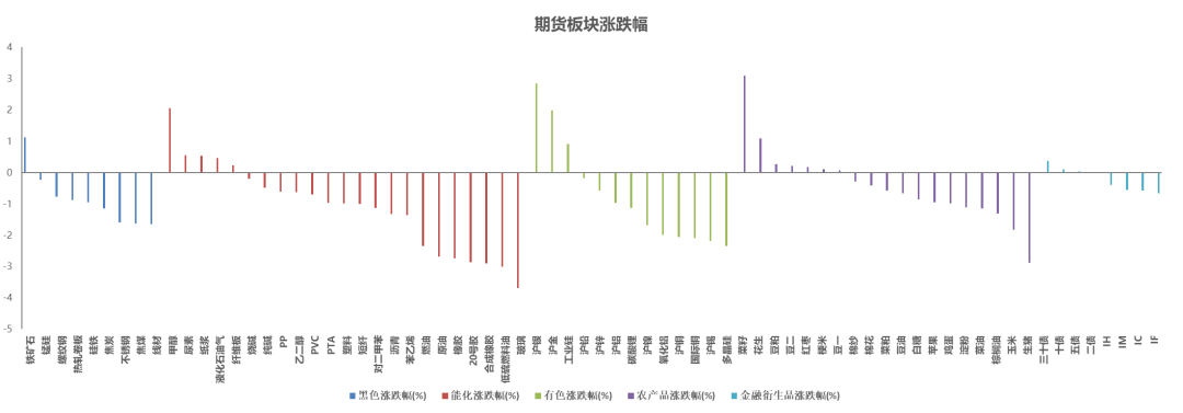 从板块整体表现看,贵金属上涨,能化、黑色多数下跌。