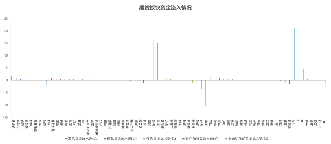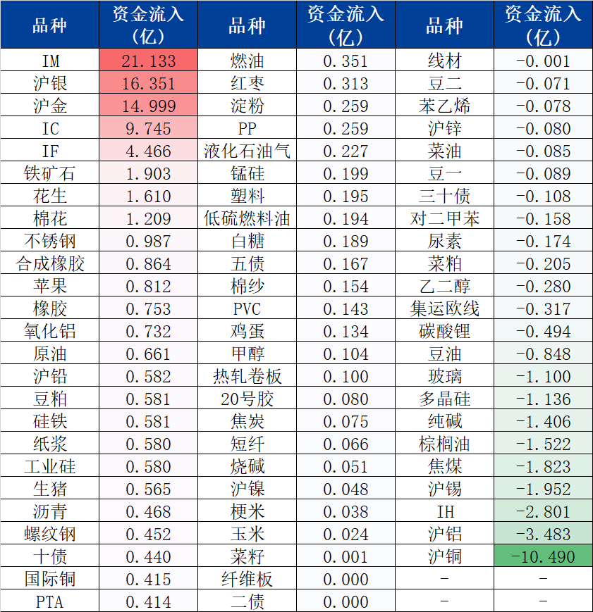 资金流入前三名为IM、沪银和沪金;流出前三名分别为沪铜、沪铝和IH。