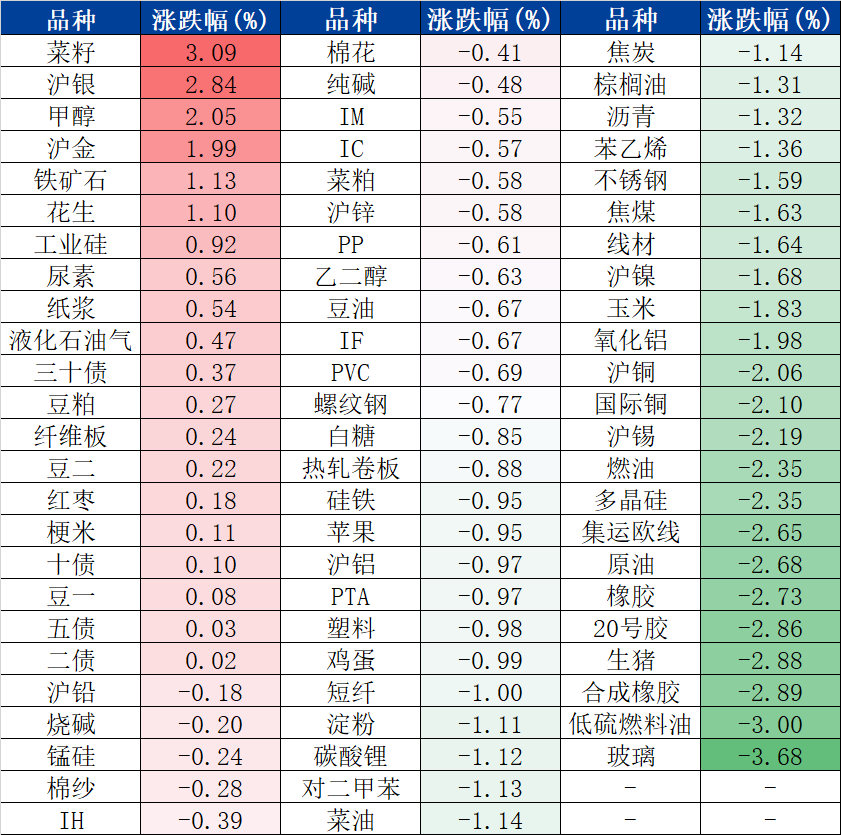 涨幅居前的三个品种分别是菜籽、沪银和甲醇;跌幅居前的是玻璃、LU燃油和合成橡胶。