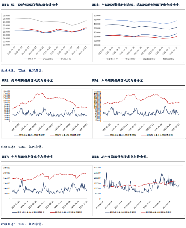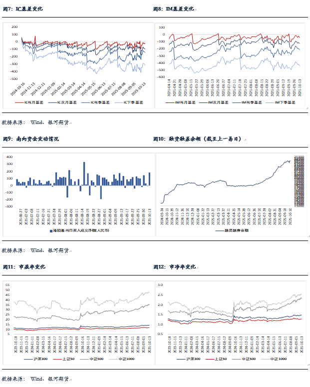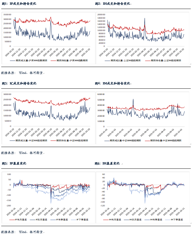 股指期货随现货波动,至收盘,主力合约IH2512跌0.39%,IF2512跌0.67%,IC2512跌0.57%,IM2512跌0.55%。各品种基差小幅下行。IH成交下降0.5%,IC、IF和IM成交分别增加3.7%、3.8%和22.7%;IM、IC和IF持仓分别增加4%、2.9%和1.7%,IH持仓下降2.1%。