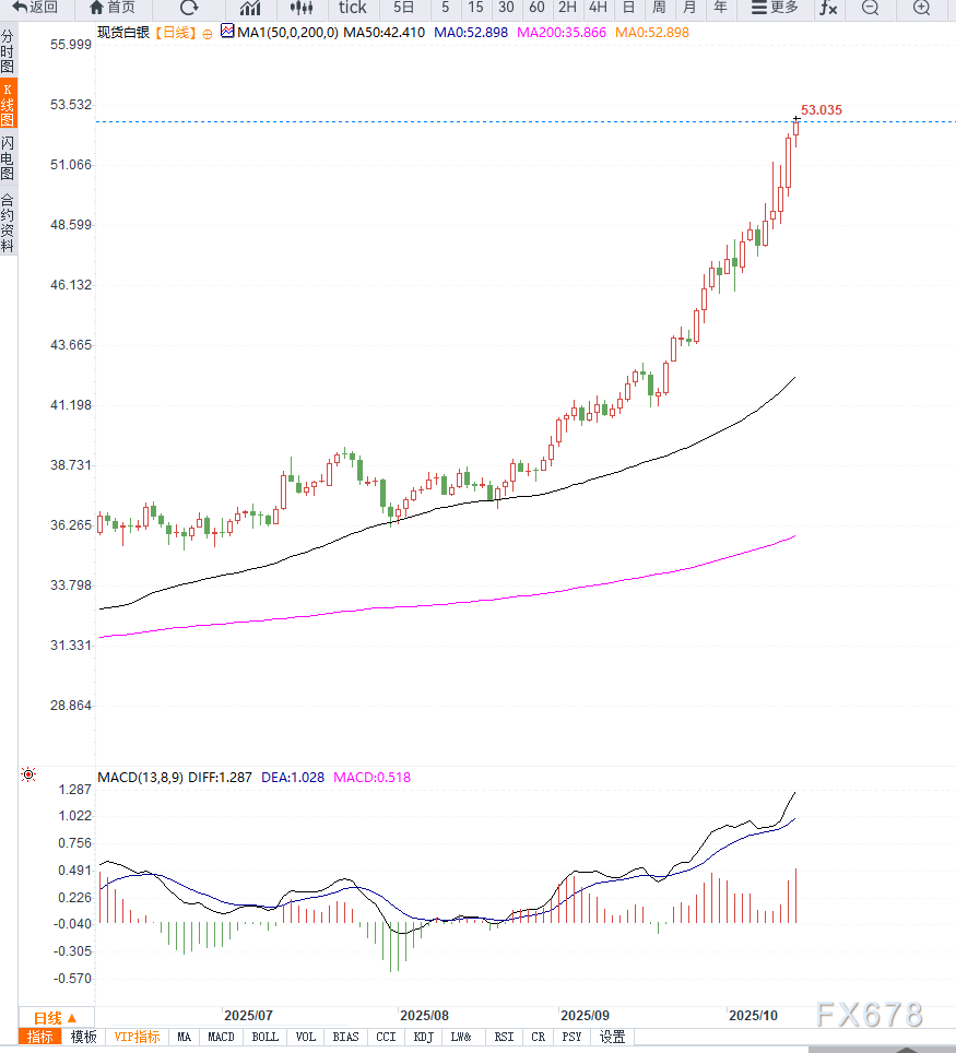 从技术角度看,白银价格在突破50美元的心理关口后加速上行,形成典型的突破性多头趋势。当前价格高位运行于布林带上轨附近,短期支撑位位于51.20美元,下方强支撑见于49.80美元。