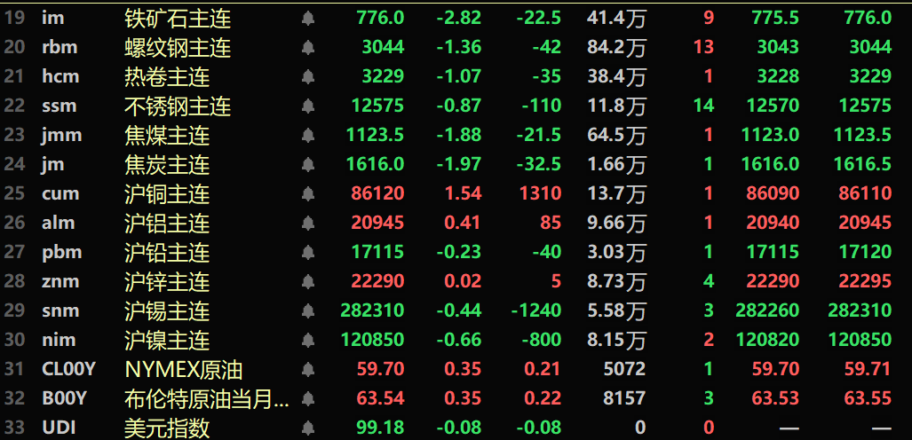黑色系均飘绿,铁矿跌2.82%,螺纹跌1.36%,热卷跌1.07%,不锈钢跌0.87%。双焦方面:焦煤主力合约跌1.88%,焦炭主力合约跌1.97%。