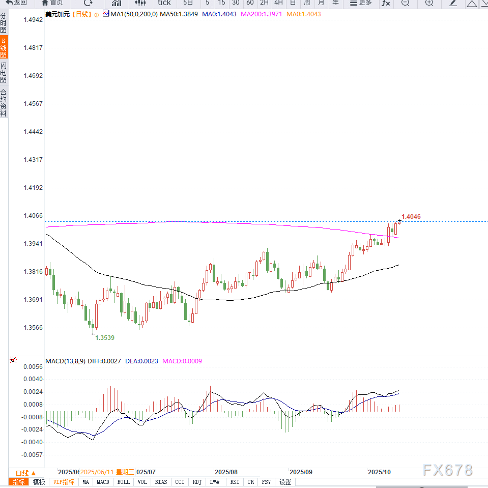技术分析师David Lee指出:“在高位震荡期间,若美联储言论偏鸽,美元兑加元存在短线回调风险,关键支撑在1.3980附近。”