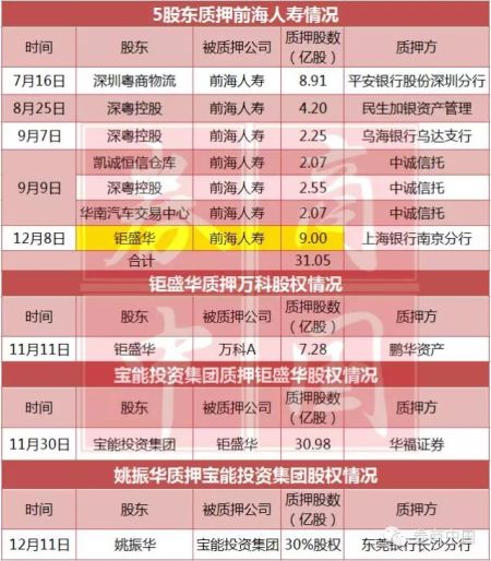 最后是宝能系的掌门人姚振华在12月11日将宝能投资集团30%的股权质押给了东莞银行长沙分行。