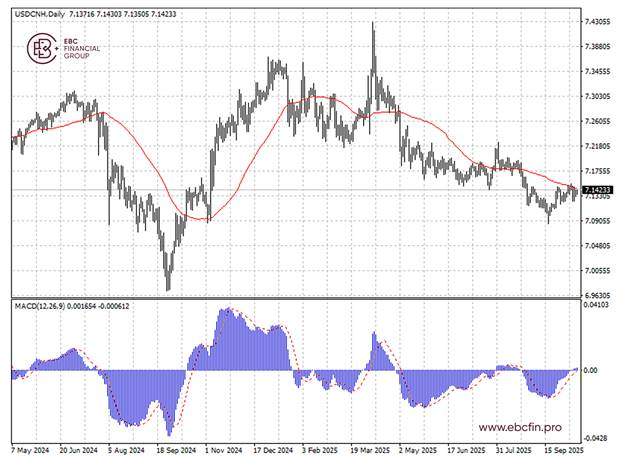 人民币汇率持续在50日均线附近震荡整理,MACD背离信号暗示存在下行潜力。我们预计短期内人民币兑美元汇率将重新测试7.1480关口。
