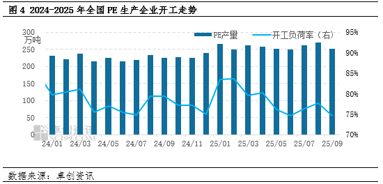 2025年9月份国内PE开工负荷在74.72%,较8月份下降2.96个百分点,较去年同期下降4.62个百分点。9月石化供应端多套装置安排短期检修,叠加传统“金九”备货周期启动迟缓,下游补库力度不及预期,行业开工负荷率承压下行。