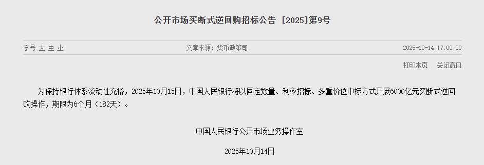 10月14日,央行发布公告,为保持银行体系流动性充裕,2025年10月15日,中国人民银行将以固定数量、利率招标、多重价位中标方式开展6000亿元买断式逆回购操作,期限为6个月(182天)。