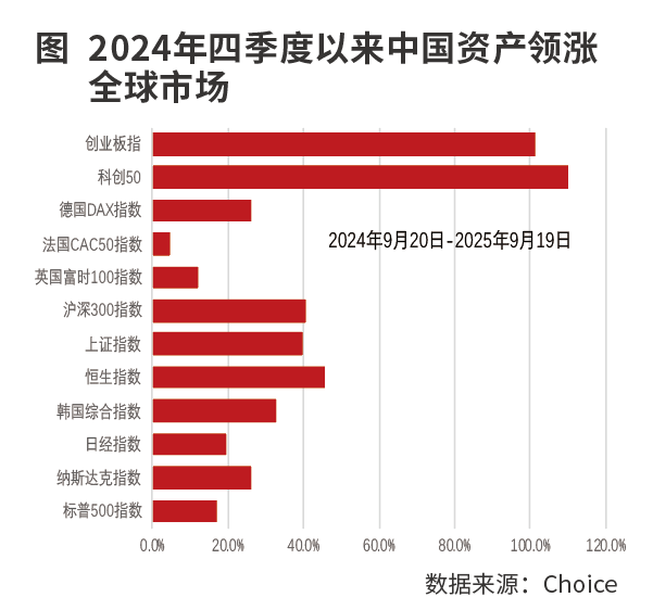 稳市场机制的逐步完善,大大稳定了市场预期,提升了A股资产的吸引力,增强了投资者的信心,有利于市场更好地反映基本面,为2025年A股的持续走牛提供了支撑。从2024年9月20日至2025年9月19日,中国资产领涨全球,期间上证指数上涨39.6%,沪深300指数上涨40.6%,恒生指数上涨45.4%,创业板指数和科创50指数更是大幅上涨超100%。