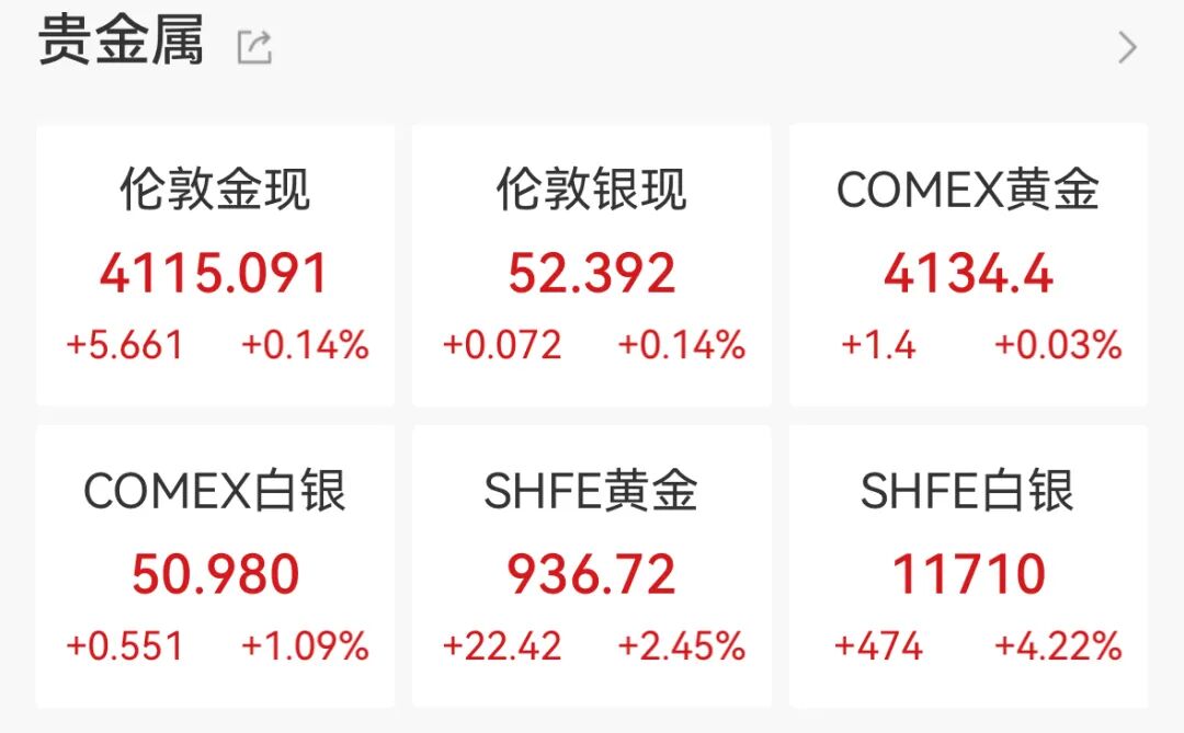 10月14日早间,国际金价继续飙升,伦敦金现与COMEX黄金分别涨超4115美元/盎司、4130美元/盎司,续创历史新高。白银价格也突破50美元/盎司。