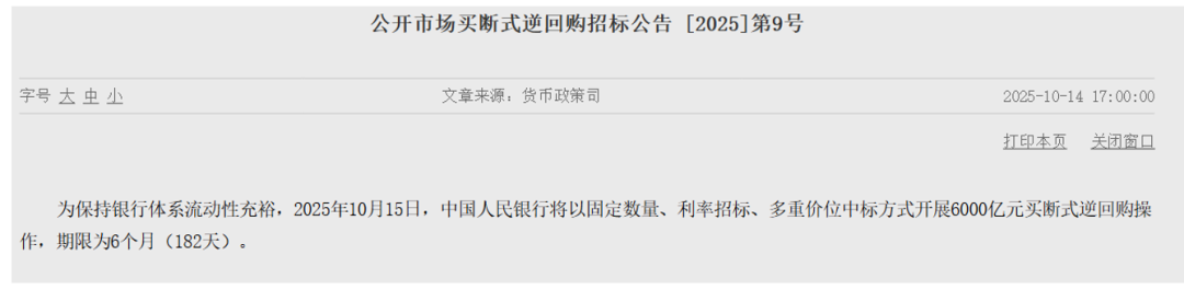 中国人民银行10月14日消息,为保持银行体系流动性充裕,10月15日,中国人民银行将以固定数量、利率招标、多重价位中标方式开展6000亿元买断式逆回购操作,期限为6个月(182天)。