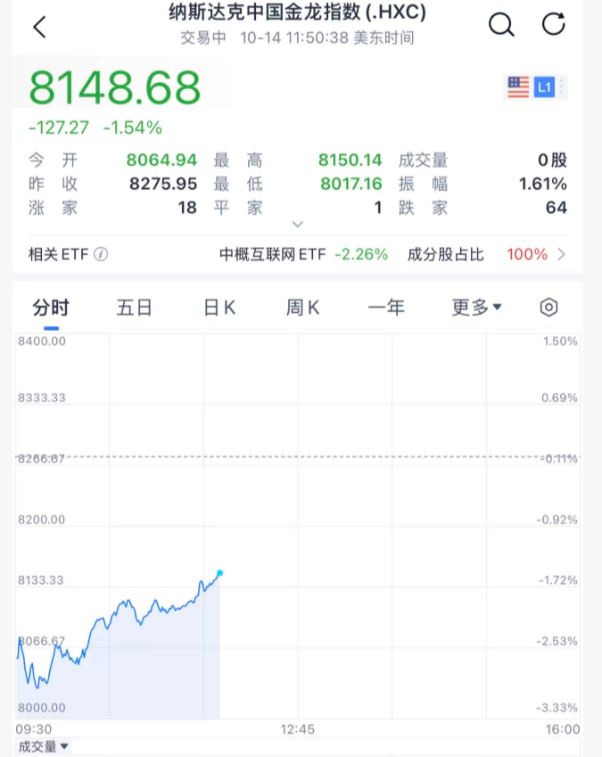 中概股方面,也从开盘的低位不断回升,目前跌约1.5%。