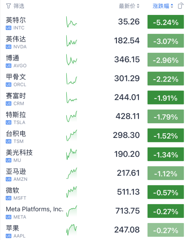 今晚美股领跌的是AI科技股,英伟达下跌超3%、特斯拉和甲骨文分别下跌1.79%与2.22%。