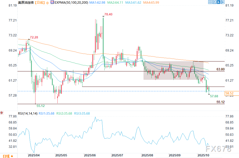 汇通财经APP讯——周二(10月14日),WTI原油期货下跌超过2%,跌破上周58.22美元的低点,并测试自6月初以来未见的水平。大量抛售将价格推低至57.68美元,5月30日的底部55.74美元现在成为下一个关键支撑位,有望触及。这一走势延续了急剧的看空趋势,因为西得克萨斯中质原油继续低于50日和100日移动平均线——分别为62.98美元和64.11美元——巩固了下跌势头。