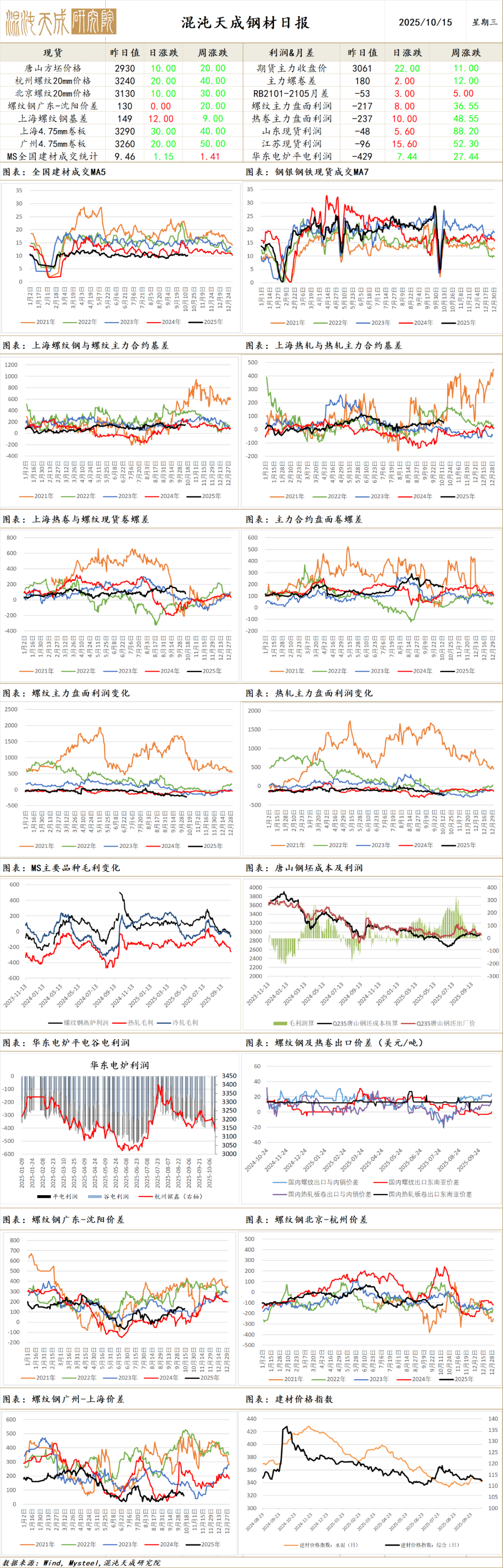 需求端,节后机构数据均显示钢材厂库、社库均有上升,总库存有明显增长,而钢材表需普遍回落。另据百年建筑调研,节后全国水泥出库量234.75万吨,环比下降6.8%,基建水泥直供量环比下降3.2%;混凝土发运量为145.27万方,环比下降近3%,显示节后建筑下游主要需求指标均有走弱。海外方面,假期美政府停摆,美债规模继续上升,美元信用减弱,叠加当前中美贸易博弈不确定性增大,近日贵金属及有色等外盘商品走势大幅波动。国内方面,昨日发改委印发《节能降碳中央预算内投资专项管理办法》,支持钢铁等行业节能降碳改造,国内政策预期依然向好,但受中美博弈升级影响,短期国内商品氛围也偏弱。进出口方面,昨日中东、独联体及美国部分地区钢价小幅走弱,国外其它地区钢价持稳,目前国内外冷热卷价差变动不大,国内钢材仍有一定出口空间。