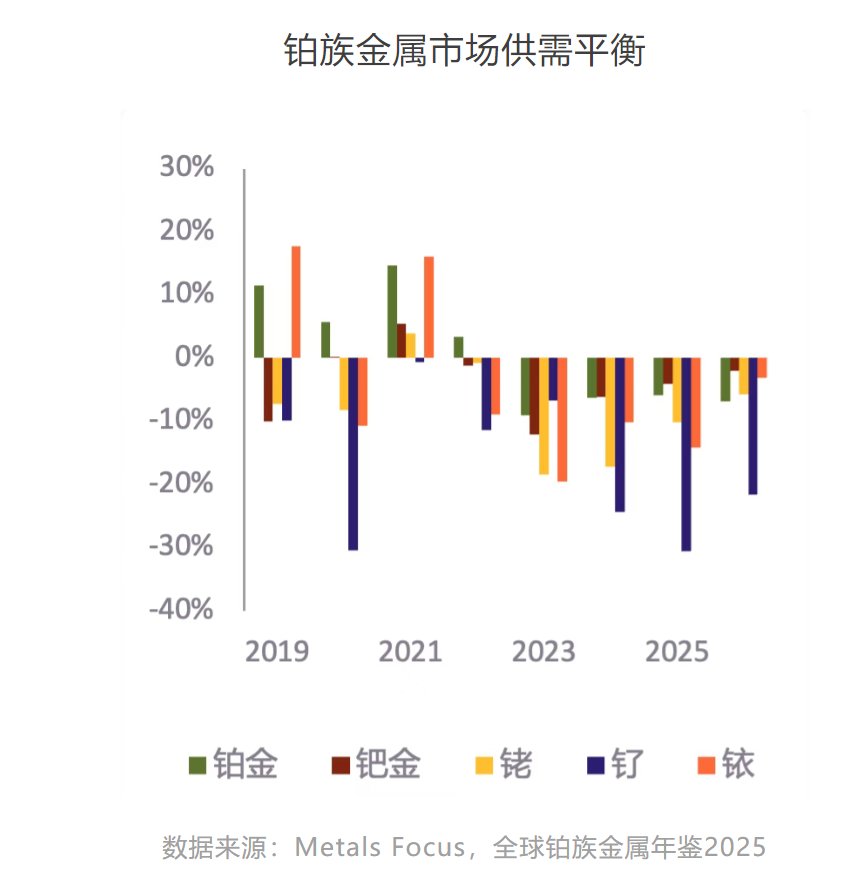 今年五种铂族金属均处于供应短缺状态,预计这一缺口将延续至2026年。铂金供应短缺预计将进一步扩大,钯金供需缺口则预计将出现收窄,但值得关注的是,这一预测与一年前市场仍预期出现盈余的判断形成鲜明反差。由于电动汽车渗透率提升(尽管增速低于预期)抑制需求,同时回收率提升的影响逐步显现,铑供需缺口预计也将收窄。随着氮氧化物排放标准趋严,含铑量更高的废汽车尾气催化剂正逐步回流市场。铱供应短缺主要是由于矿山产量疲弱及电子行业的强劲需求。最后,钌供需缺口主要来源于中国化工生产强劲增长及以及AI应用迅速普及带动硬盘驱动需求增加。