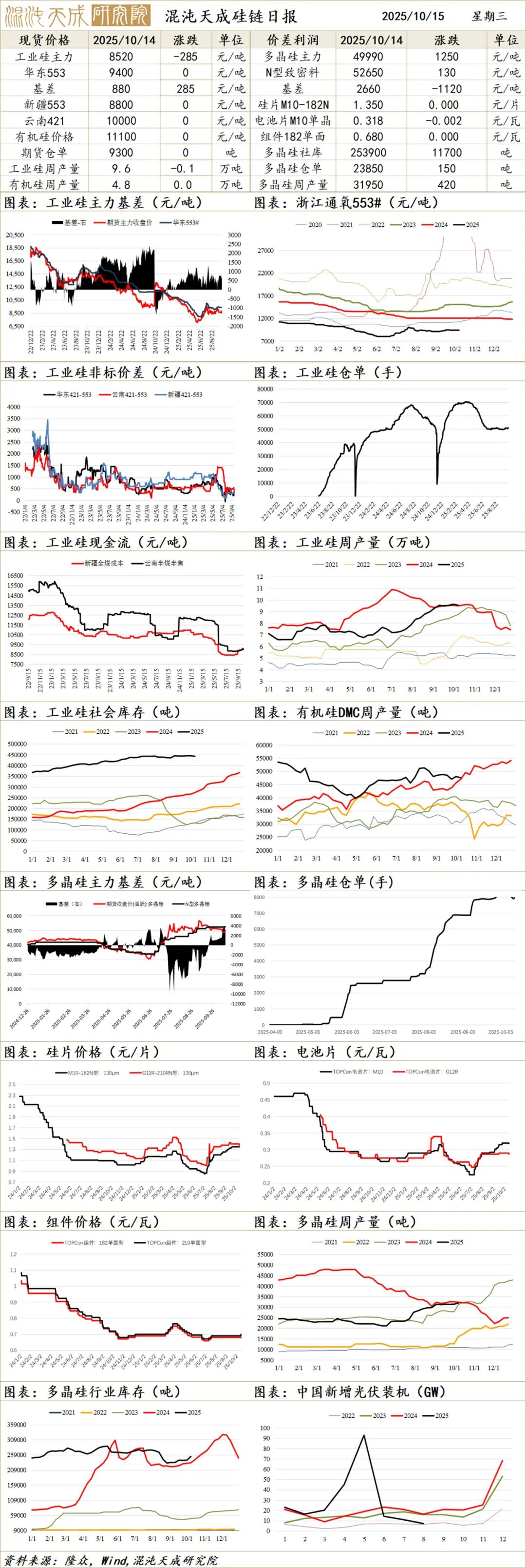 1、反内卷实际影响不大,核心驱动看供需;10月供增需稳,11月供需双弱。目前看因西南将入枯水期,供应弹性下降,核心关注合盛复产情况(本周传因矿临停4台炉,影响不大);若合盛继续复产,累库压力持续上升,若保持当前开工,预计大致平衡。