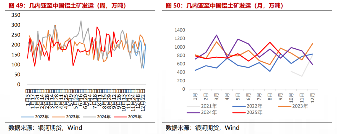 阿联酋EGA几内亚子公司GAC的铝土矿出口从2024年10月开始被几内亚海关暂停,2023年EGA生产1400万吨铝土矿,占几内亚11%,占全球3.6% 。从几内亚铝土矿发运数据来看,2025年1-9月几内亚发运至中国铝土矿约7311万吨,较去年同期减少12.08%,月均发运约减少110万吨左右,若宁巴矿山复产,或每月带来一百多万吨的运输需求增量。