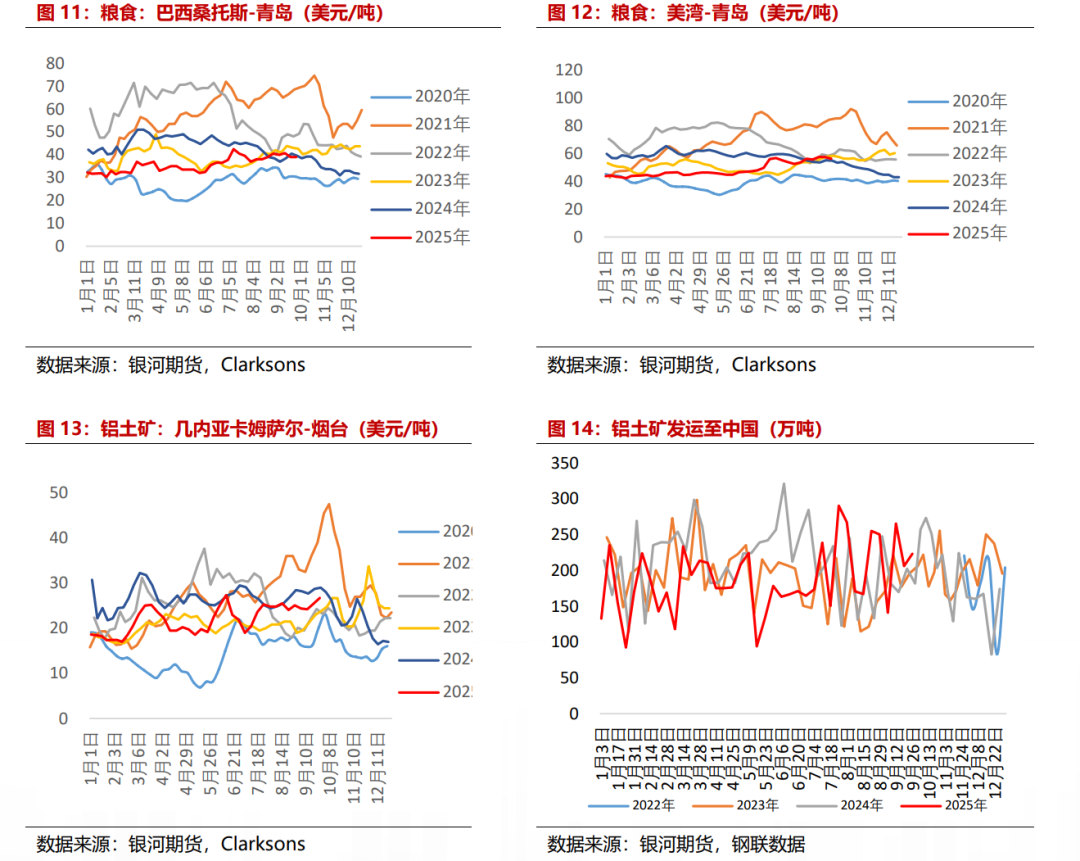 粮食运价先升后跌,铝土矿运价先跌后升。粮食航线运价:截至9月26日,巴西桑托斯-青岛报39.00美元/吨,较上月末-3.70%,同比去年同期-1.27%,月均运价为39.69美元/吨,月均环比+3.08%,美湾-青岛报56.10美元/吨,较上月末-0.02%,同比去年同期+2.45%,月均运价为56.61美元/吨,月均环比+4.51%,几内亚卡姆萨尔-烟台报26.70美元/吨,较上月末+6.37%,同比去年同期-7.93%,月均运价为25.18美元/吨,月均环比+1.31%。本月几内亚发运至中国铝土矿小幅波动,截至9月26日,9月几内亚发运至中国的铝土矿836万吨,较上月同期减少0.89%。