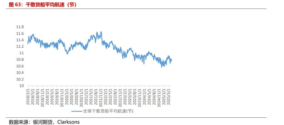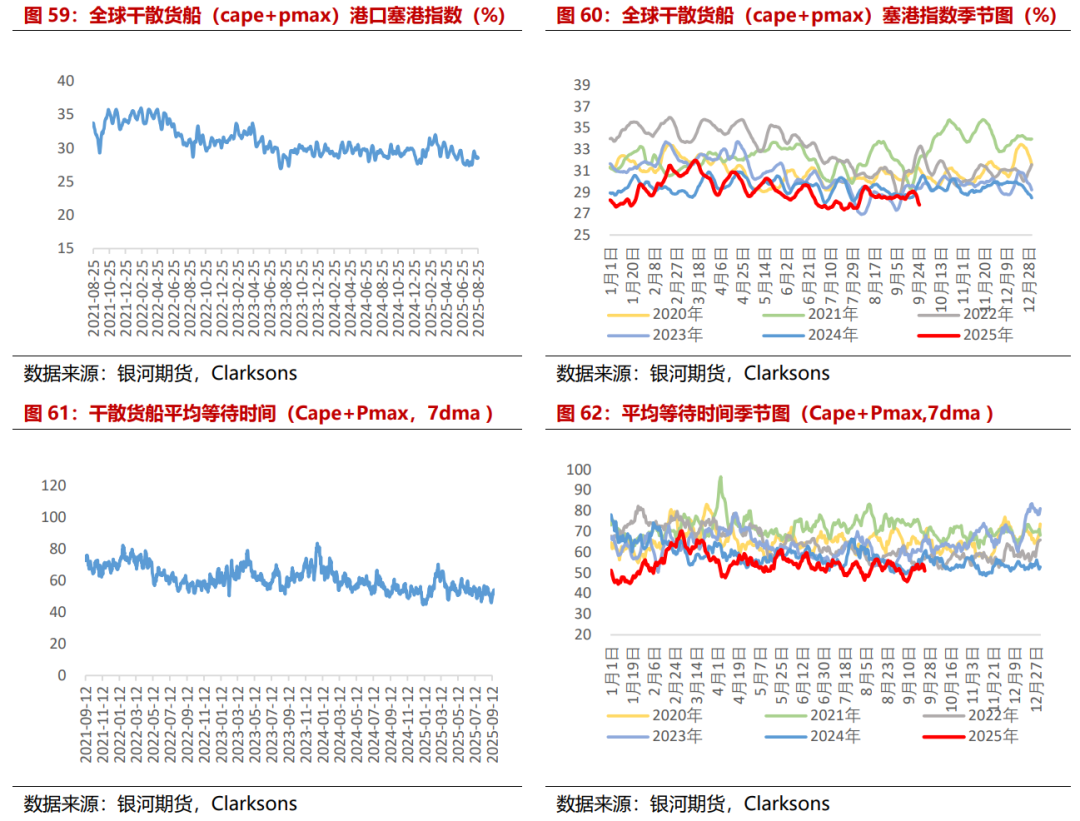 全球干散货船港口等待时间基本持稳。Clarksons塞港指数显示,截至2025年9月25日,Clarksons全球大中型干散货船塞港指数报27.81%,较上月末-0.70%,月均值为28.60%,环比-0.03%。从等待时间上来看,截至9月24日,全球集干散货船(Cape+Pmax,7dma)的平均等待时间50.97个小时,相较上月末增加0.01个小时。干散货船平均航速略有降低,截至9月25日,干散货船平均航速为10.78节,相较上月末平均航速减少0.04节。