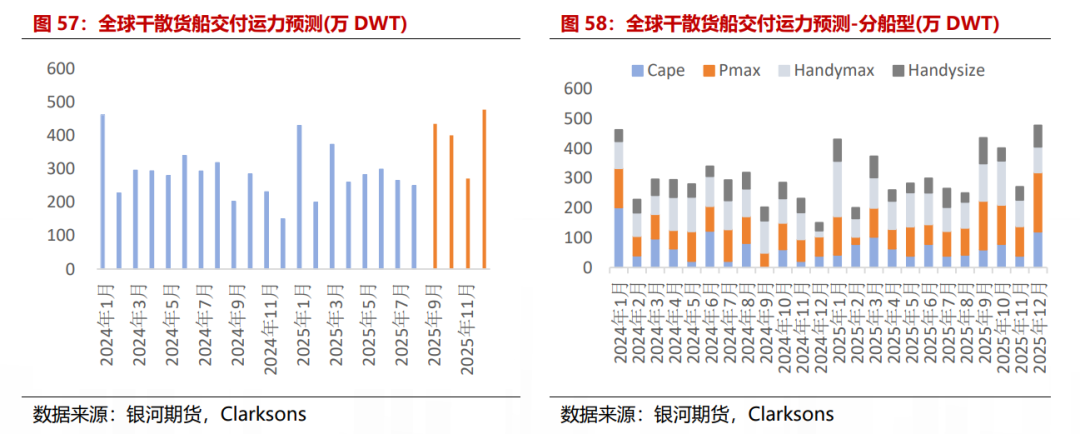 2025年运力交付以中小型船为主,占比近80%。根据干散货船交付排期预测(不考虑拆解),2025年9月预计约有435万DWT干散货船待交付,约占现有运力的0.41%,预计2025年交付总量3949万DWT,占年初总运力的3.74%。其中Cape型船783万DWT,占比19.84%,Panamax型船1247万DWT,占比31.57%,Handymax型船1284万DWT,占比32.52% , Handysize型船635万DWT,占比16.08% ,其中中小型船合计占比约80%。