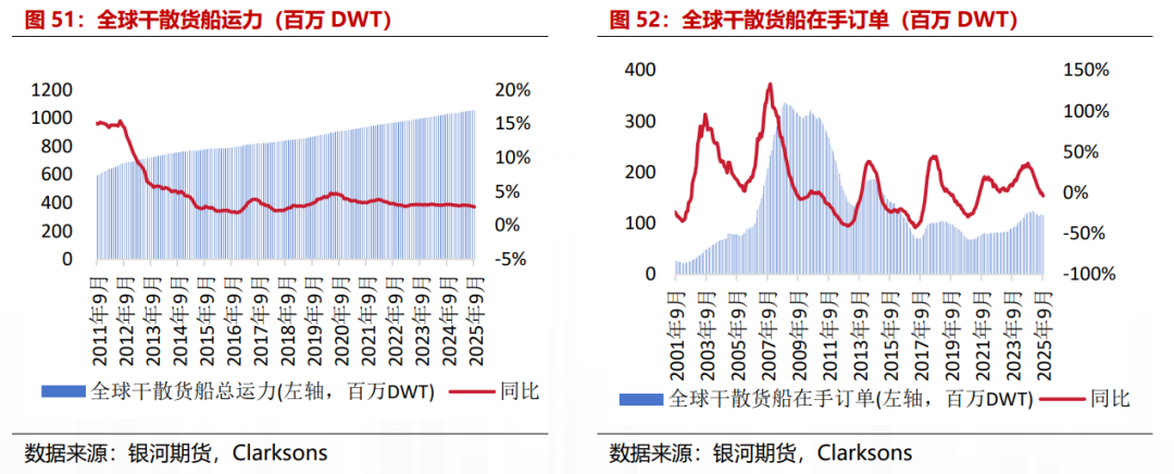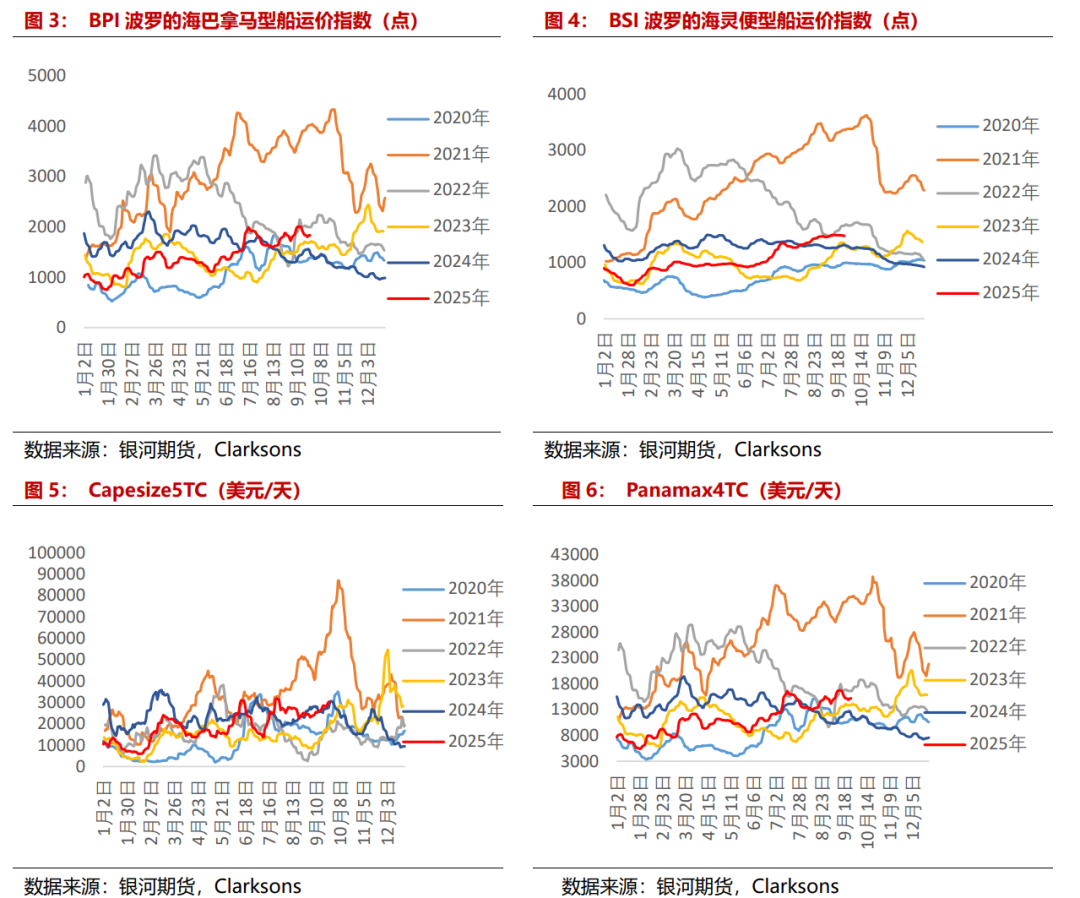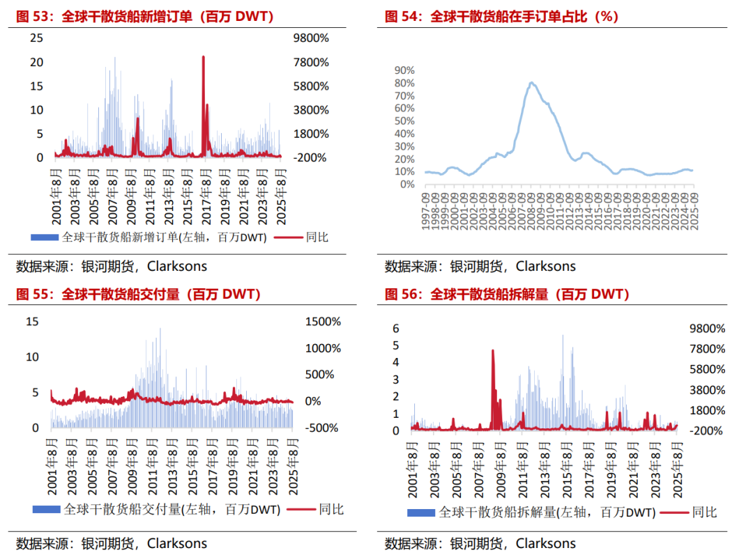 干散货船运力增速持稳。供应方面,截至2025年9月,全球干散货船现有运力14450艘,运力约10.56亿DWT,环比上月+0.18%,同比+2.70%,其中海岬型船共有2048艘,运力约4.05亿DWT,较上月+0.03%,同比+1.21%,占干散货船总运力的38.35%;巴拿马型船共有3295艘,运力约2.68亿DWT,较上月+0.34%,同比+2.93%,占干散货船总运力的25.36%,大灵便型船共有4417艘,运力约2.53亿DWT,较上月+0.28%,同比+4.32%,占干散货船总运力的23.93%,灵便型船共有4690艘,运力约1.3亿DWT,较上月+0.15%,同比+3.85%,占干散货船总运力的12.35%。2025年8月干散货船新船交付35艘,运力约250万DWT,交付运力占现有船舶运力的0.24%。从新增订单来看,8月干散货船新增订单量4艘,运力约17万DWT。从拆解量来看,8月干散货船拆解量10艘,运力约55万DWT。截至2025年9月,手持订单共计1386艘,运力约1.15亿DWT,占现有运力的10.92%。
