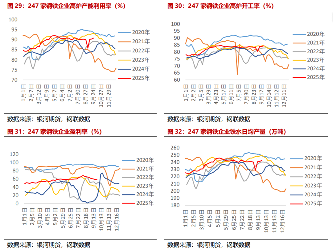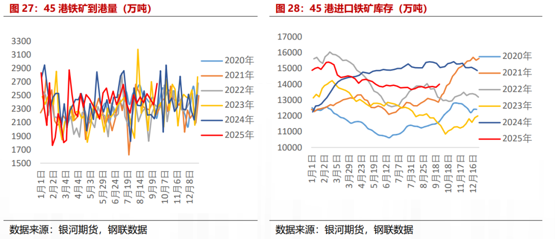 从铁矿下游产业端来看,下游需求较上月增加,港口库存略有增加。近期247家样本钢厂日均铁水产量有所回升,钢厂盈利率有所下降,截至9月26日,247家钢铁企业日均铁水产量为242.36万吨,较上月末+0.93%,月度周均环比-0.95%,盈利率为58.01%,较上月末-5.63%,月度周均环比-6.17%。目前国内45港口铁矿库存为1.40亿吨,较上月末+1.72%。