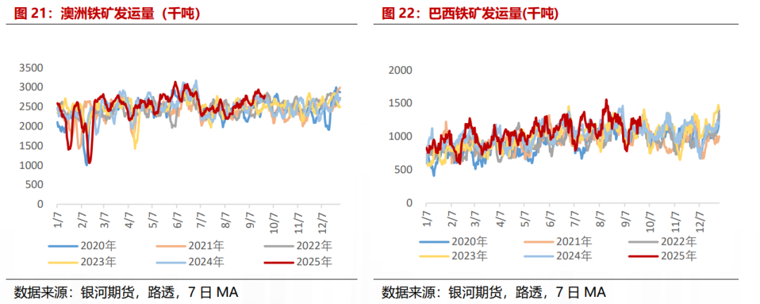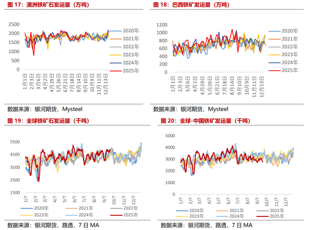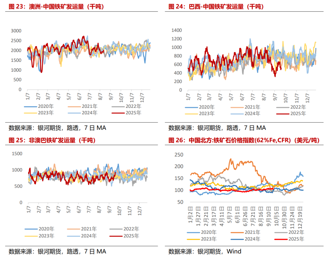 从铁矿港口发运来看,9月发运量环比增加,主要增量来自澳大利亚。根据路透数据统计,截至9月25日全球铁矿发运1.15亿吨,较上月同期+4.00%,同比+0.93%,其中,澳大利亚发运6874万吨,较上月同期+13.70%,同比+3.39%,巴西发运2708万吨,较上月同期-12.17%,同比+0.41%,非澳巴发运1902万吨,较上月同期-0.60%,同比-6.42%。