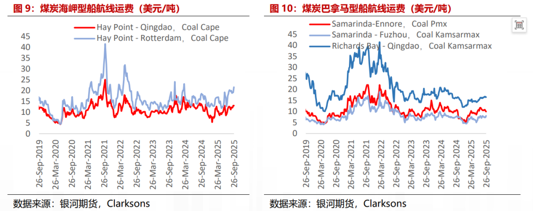煤炭航线运价涨跌互现。从煤炭主要航线海岬型船运费来看:截至9月26日,澳大利亚海因波特-青岛航线运价报12.95美元/吨,较上月末+6.58%,同比去年同期-4.07%,月均运价为12.50美元/吨,月均环比+3.82%,澳大利亚海因波特-鹿特丹运价报21.50美元/吨,较上月末+8.04%,同比去年同期+16.22%,月均运价为19.59美元/吨,月均环比-1.17%,煤炭航线巴拿马型船运价:印尼萨马琳达-印度恩诺报9.95美元/吨,较上月末-5.24%,同比去年同期-5.24%,月均运价为10.43美元/吨,月均环比-2.11%,印尼萨马琳达-福州报8.00美元/吨,较上月末+6.67%,同比去年同期+4.44%,月均运价为7.50美元/吨,月均环比-0.66%,南非理查德-青岛持稳报16.50美元/吨,同比去年同期+1.35%,月均运价为16.56美元/吨,月均环比+2.24%。