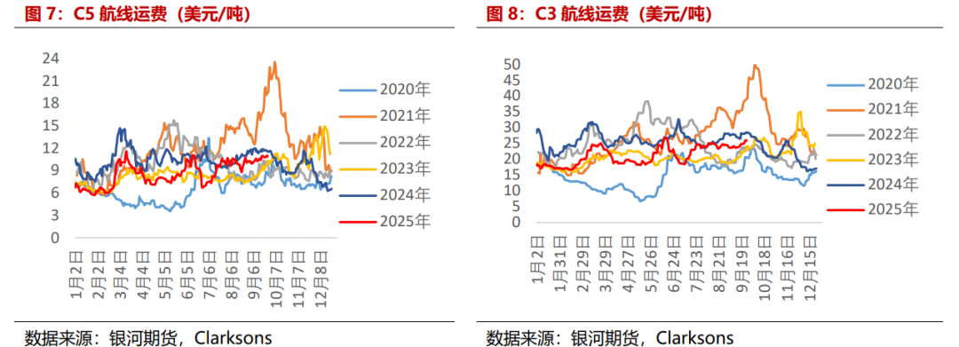 从后续发运需求来看,考虑矿山发运季节性,预计澳洲10月铁矿运输需求将有所减少,巴西市场10月下半月货盘有所增加,进入11月铁矿货盘将会再度减少;此外需关注几内亚西芒杜铁矿首船发运预计在11月左右,及几内亚宁巴矿山铝土矿复产情况,若西芒杜铁矿发运及宁巴矿山复产将会对大西洋市场提供一定的运输需求支撑。市场预计2025年西芒杜铁矿发运将在300万吨左右,宁巴矿山复产后预计年产能1400万吨左右,预计每月也能带来100多万吨的发运增量。