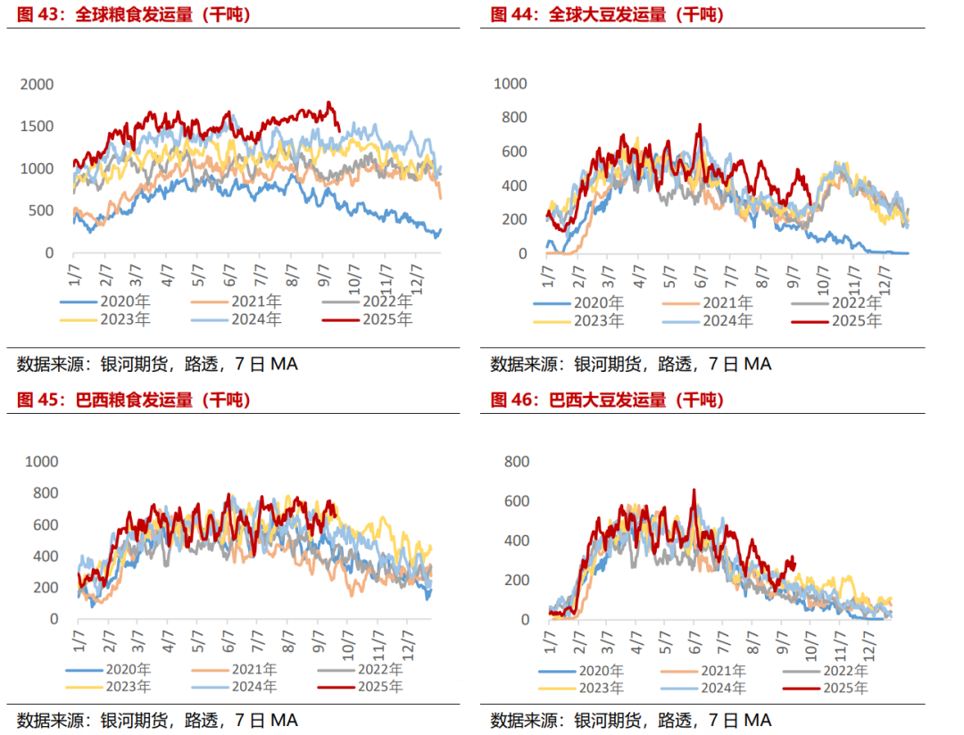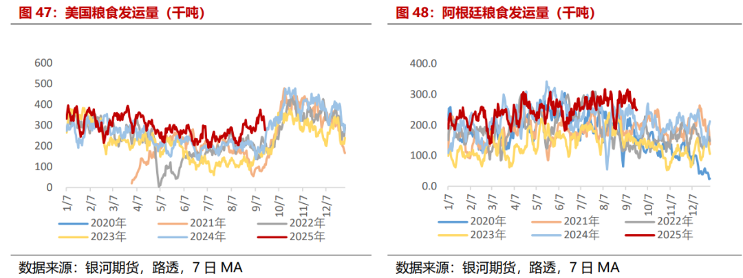 从粮食发运来看,9月粮食发运环比小幅波动,但同比出现明显增加。根据路透数据统计,截至9月21日,9月全球农产品发运3438万吨,较上月同期-0.03%,同比+27.18%。其中巴西粮食发运约1397万吨,较上月同期-8.36%,同比+16.80%,美国粮食发运约573万吨,较上月同期+5.28%,同比+36.21%,阿根廷粮食发运约577万吨,较上月同期+6.99%,同比+20.83%,全球大豆发运约876万吨,较上月同期-8.57%,同比增+54.80%,巴西大豆发运约554万吨,较上月同期-20.65%,同比+39.07%。