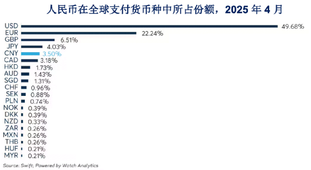 该行表示,截至2025年4月,中国在全球SWIFT支付市场所占份额已达到3.5%,较2023年的2%录得上升。贸易方面,在2024年有6%的全球商业活动使用人民币结算,同样较2023年的不到2%有所上升。