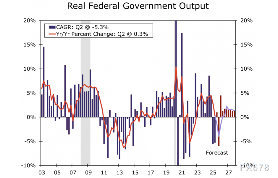 待第四季度实际GDP数据最终发布时,政府停摆期间产出的损失必将拖累经济增长。政府停摆每持续一周就会削减退0.1-0.2个百分点的季度经济增长——这一经验法则在目前看来仍具参考价值。