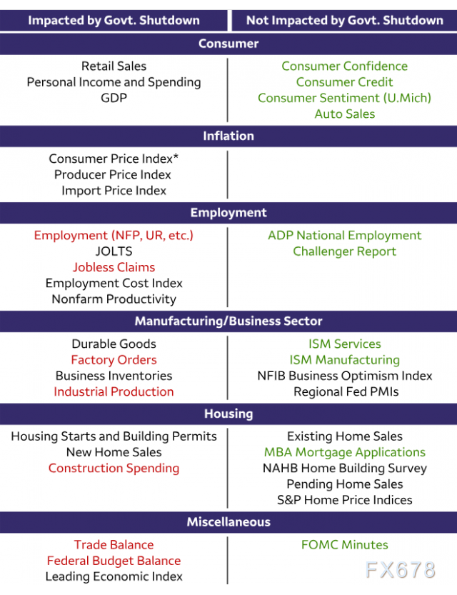 以经济数据发布为例:2013年停摆期间,10月份大部分数据均推迟数周发布。原定10月4日发布的非农就业报告最终延迟至10月22日(延迟了18天)(停摆结束后第六天)才公布;随后11月的就业报告又推迟约一周,所幸劳工统计局当时报告称2013年10月就业调查的回复率仍处于正常范围。同期CPI报告也出现类似延迟,且当年用于计算10月CPI的价格样本采集量仅达常规水平的75%。
