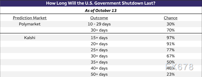 目前看来,能够推动双方达成解决方案的痛点或缓冲机制正日趋难以寻觅。鉴于经济与金融市场尚未出现剧烈阵痛,政府服务也未发生重大中断,市场对停摆持续时间的预期正不断延长。Polymarket、Kalshi等预测市场平台数据显示,停摆持续至10月底的概率已升至约70%。