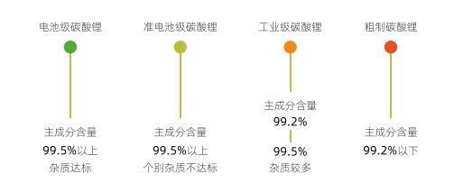 碳酸锂根据其主成分含量、粒度、化学指标以及纯度被分为工业级碳酸锂与电池级碳酸锂,二者均有对应的国家或行业标准。目前,行业内根据主成分含量进一步将碳酸锂细分为以下几类:主成分含量在99.5%以上,杂质达标的称为电池级碳酸锂;主成分含量在99.5%以上,但是个别杂质指标不满足电池级的,称为准电池级碳酸锂;主成分含量在99.2%6-99.5%,但是杂质相对较多的称为工业级碳酸锂,主成分含量在99.2%以下,称为粗制碳酸锂,也有称为工业级碳酸锂。随着品质越高,碳酸锂的价格越贵,但需要说明的是,多数粗制碳酸锂还是经过加工提纯变为电池级碳酸锂使用。