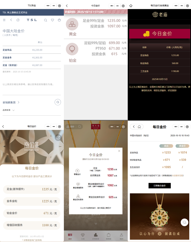具体而言,10月15日,周大福足金(饰品、工艺品类)、六福珠宝足金999/足金、谢瑞麟足金饰品、潮宏基足金(首饰摆件)境内价格以及老庙黄金上海区域足金饰品价格为1235元/克,周生生足金首饰境内价格为1233元/克,单克均较10月1日上涨超100元。
