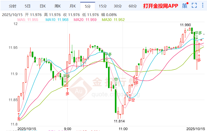 今日周三(10月15日)亚盘时段,纸白银目前交投于11.950一线上方,今日开盘于11.895元/克,截至发稿,纸白银暂报11.976元/克,上涨0.71%,最高触及11.990元/克,最低下探11.769元/克,目前来看,纸白银盘内短线偏向看涨走势。