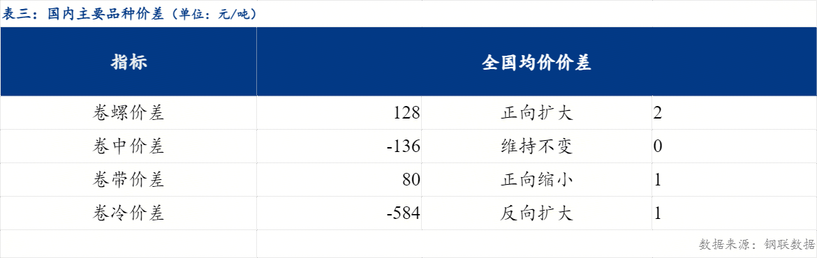 从品种价差来看,卷螺差较上一交易日正向扩大2元/吨 ,热中价差较上一交易日持平 ,热带价差较上一交易日正向缩小1元/吨 ,热冷价差较上一交易日反向扩大1元/吨 。