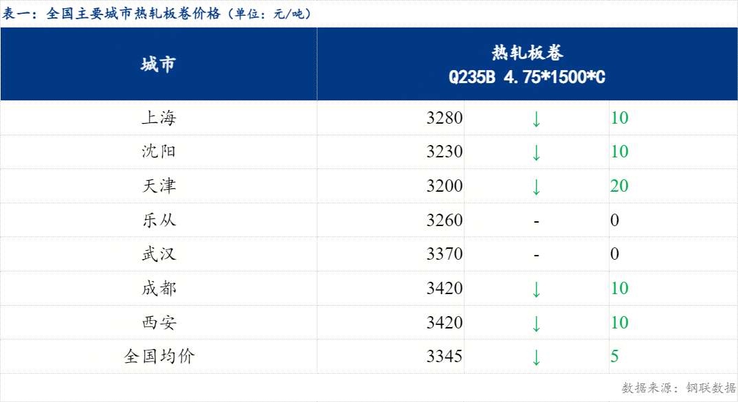 【热卷】15日热轧板卷全国主要城市价格小幅下跌,截止发稿时3.0mm热轧板卷全国均价3400元/吨,较上个交易下跌6元/吨。4.75mm热轧板卷全国均价3345元/吨,较上个交易日下跌5元/吨。今日黑色商品期货热卷01合约震荡下行,收跌0.86%,现货价格小幅下跌,整体交投氛围偏弱。