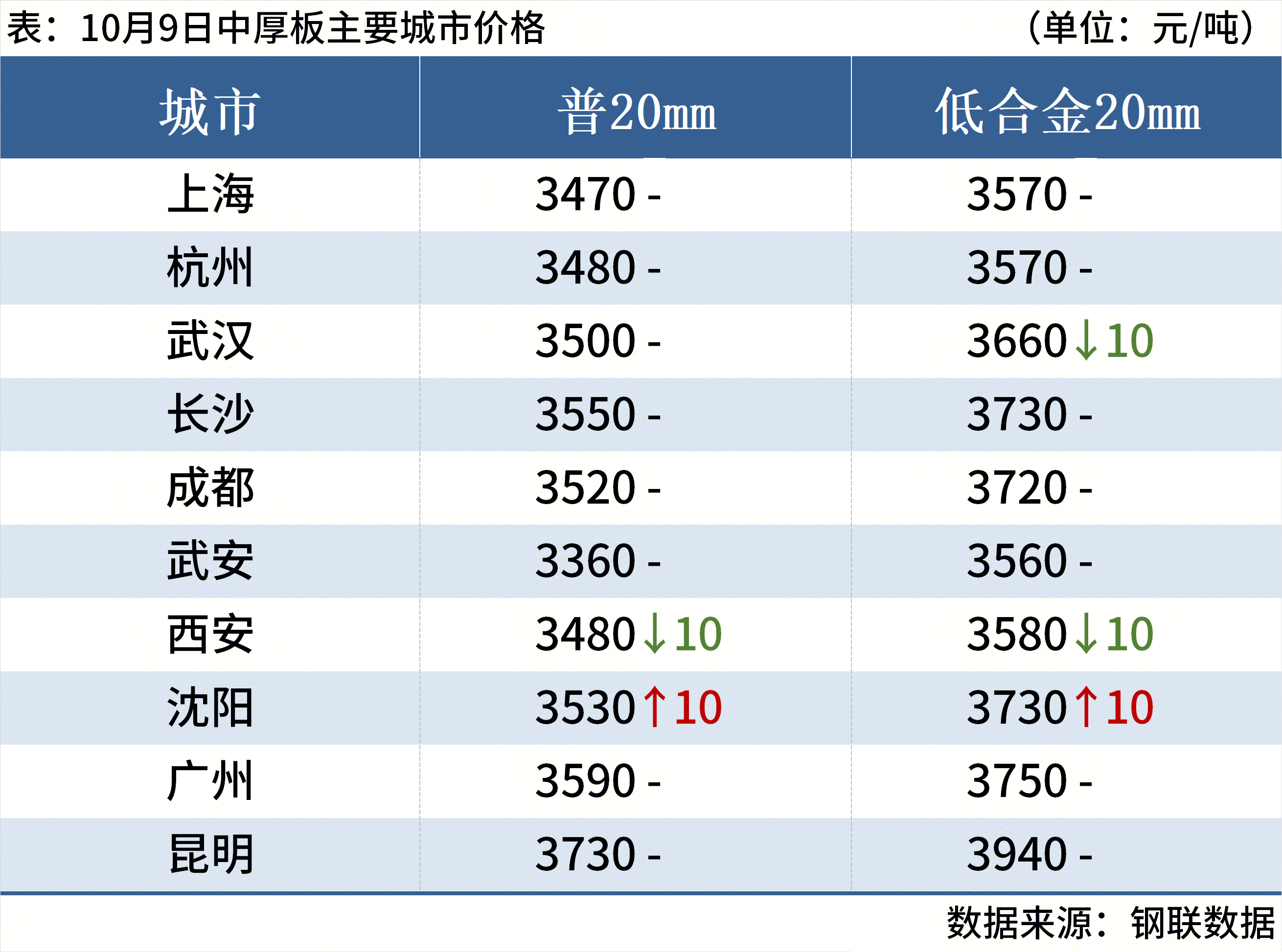中厚板:10月9日,全国24个主要城市20mm普板均价3517元/吨,较上一交易日下跌2元/吨。全国中厚板市场整体呈现供应宽松、需求疲软的格局。价格方面,国内主流市场价格保持稳定,但处于低位区间运行。贸易商备货积极性低,终端采购以按需为主。库存方面,社会库存普遍增加,凸显供需失衡。整体上,市场呈现“供强需弱”特征,库存累积与价格低位盘整并存。10日全国中厚板价格预计以稳为主,但需警惕库存压力导致的潜在下行风险。