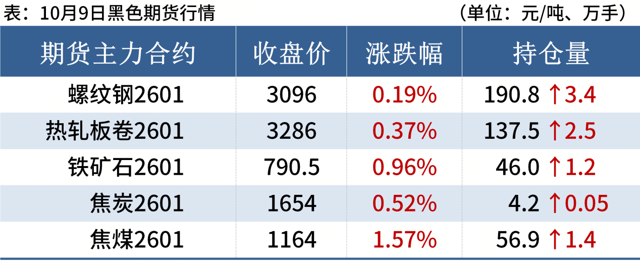 螺纹钢:10月9日,全国31个主要城市20mm三级抗震螺纹钢均价3257元/吨,较上个交易日下跌4元/吨。假期螺纹钢产量小幅下降,消费量降幅比较明显,主要受假期及南方台风影响,厂库及社库双双增加。短期来看,尽管近期产量小幅回落,但铁水依旧维持高位,同时受废钢价格影响,电炉利润继续处于亏损状态。在供应维持高位,而需求表现旺季不旺的格局下,基本面矛盾仍显突出,价格上涨压力较大。预计10日国内建筑钢材价格或将继续窄幅震荡为主。