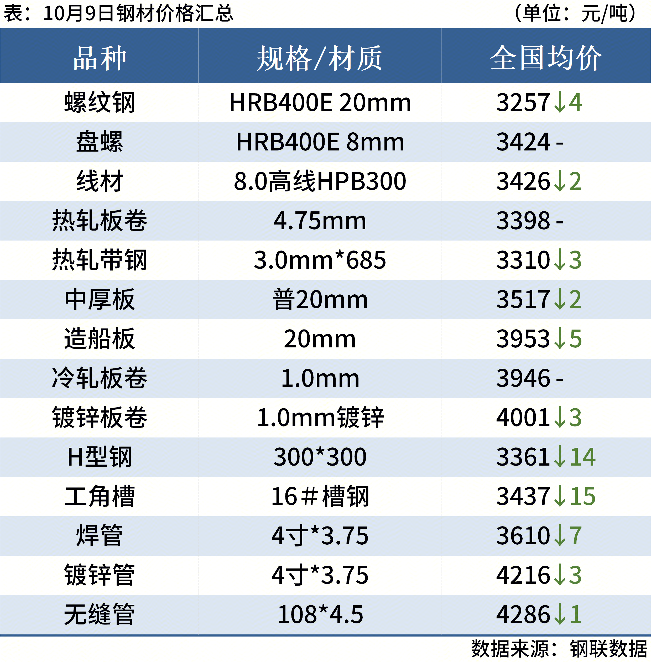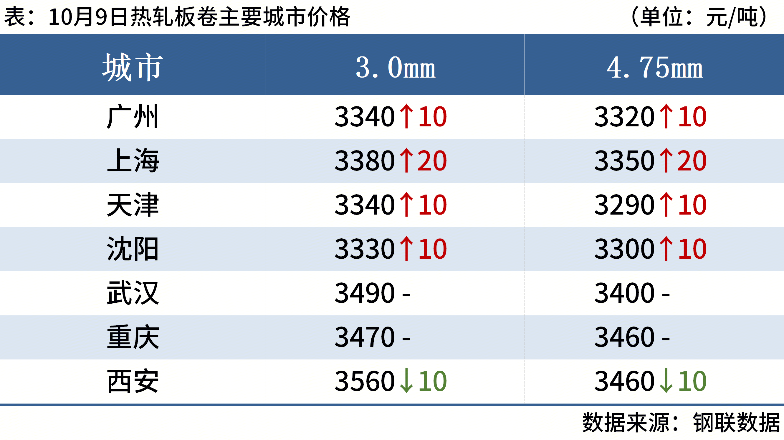 热轧板卷:10月9日,全国24个主要城市4.75mm热轧板卷均价3398元/吨,较上一交易日持平。终端有部分补库行为,成交尚可。成本端仍有支撑,但33城冷轧社会库存已到去年同期水平,且东北及华南地区累库较快,产量维持高位的情况下,后续出货难度将有所增加,对价格形成一定压制。节后市场谨慎开局,成交尚未放量,预计10日全国热轧板卷价格持稳个调。