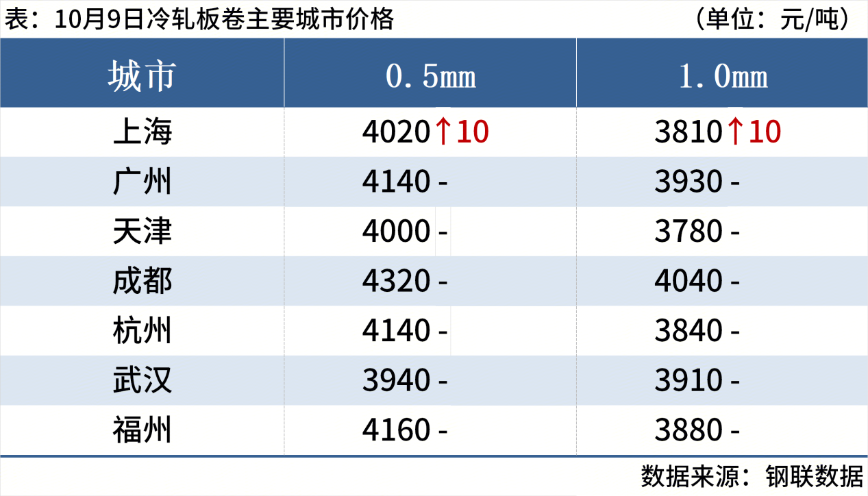 冷轧板卷:10月9日,全国24个主要城市1.0mm冷卷均价3946元/吨,较上一交易日持平。节后首日部分下游需要补库,拿货相对积极,全天成交尚可。10月8日Mysteel监测29个城市库存,本周冷轧板卷社会库存246.42万吨,周环比增加8.42万吨,月环比增加9.43万吨,放假期间仓库正常入库,但销售环节基本终止,社库维持高位运行,节后商家操作多以出货消化库存为主。综合来看,预计10日国内冷轧板卷价格或将窄幅震荡运行。