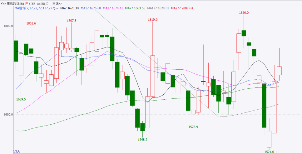 今天EC盘面震荡偏强,其中主力2512合约涨4.25%至1709点。