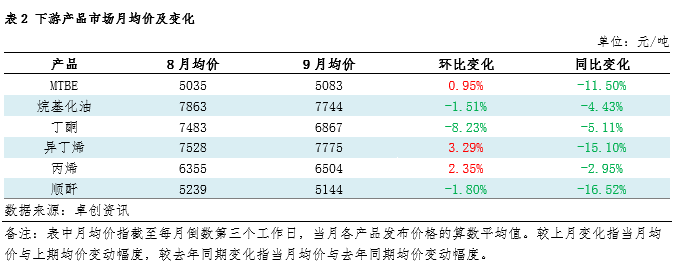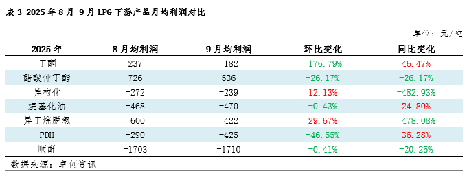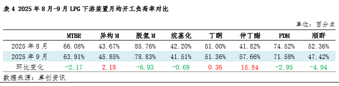 下游产品行情来看,LPG产业链下游产品在中下旬有望继续呈现震荡分化格局,供需博弈主导市场:MTBE受节后补货及出口支撑短期偏强,但新增产能释放与汽油需求转淡形成压制,走势先强后弱;烷基化油、丁酮及丙烯则因供应过剩与成本端原油承压而趋弱。综合来看,下游产品受供需或产能扩张错配影响,整体缺乏持续上行支撑。考虑具体生产情况及上下游价格变化,综合预计10月LPG深加工产业链装置利润维持亏损格局。